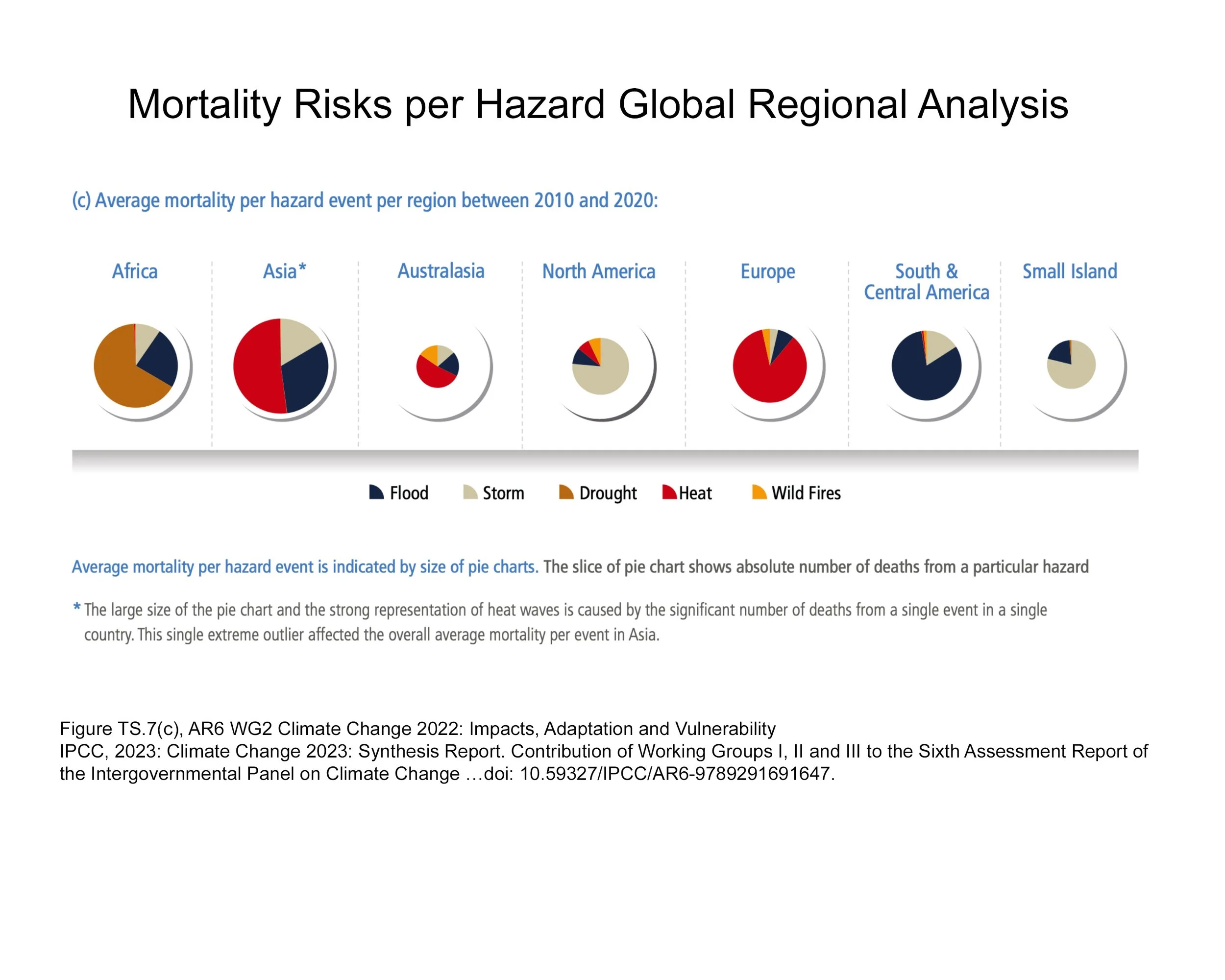 “The pie charts show the number of deaths (mortality) per hazard (storm, flood, drought, heatwaves and wildfires) event per continental region…. The size of the pie chart represents the average mortality per hazard event while slices of each pie chart show the absolute number of deaths from each hazard. This reveals that significantly more fatalities per hazard … did occur in the past decade in more vulnerable regions, e.g., Aftica and Asia…”